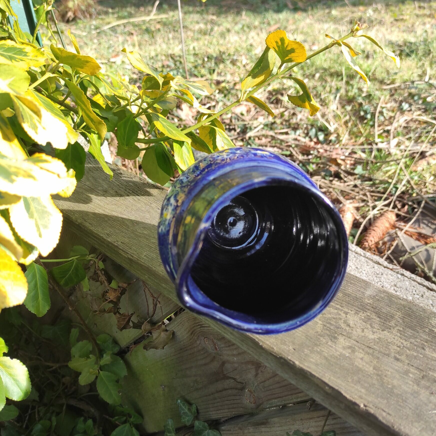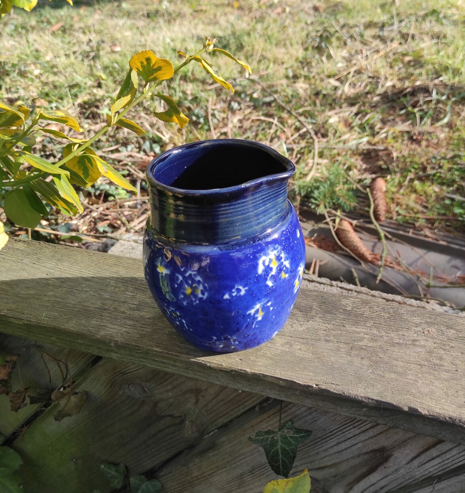 Petite carafe en grès avec un bel émail bleu nuit à l’intérieur.