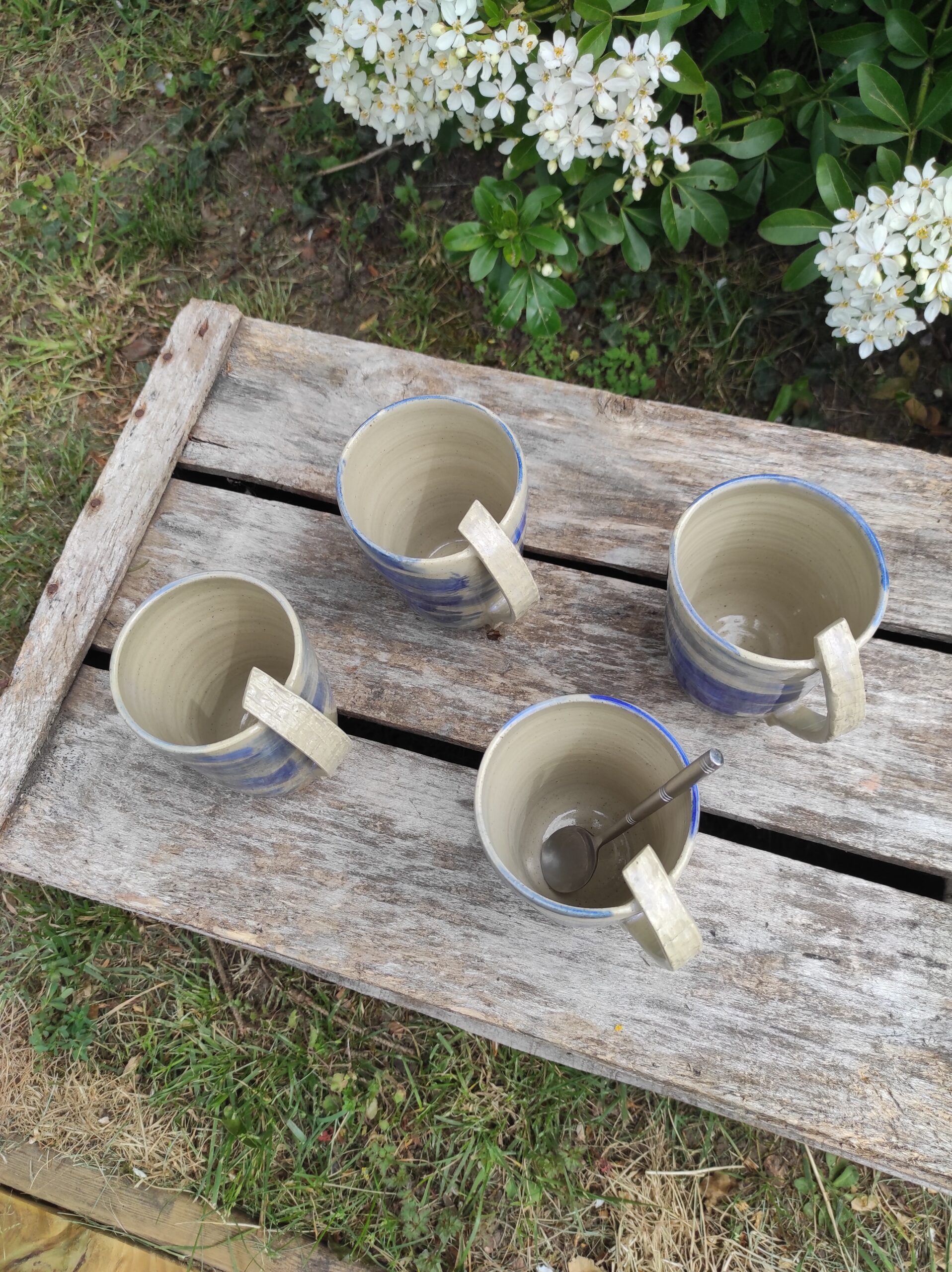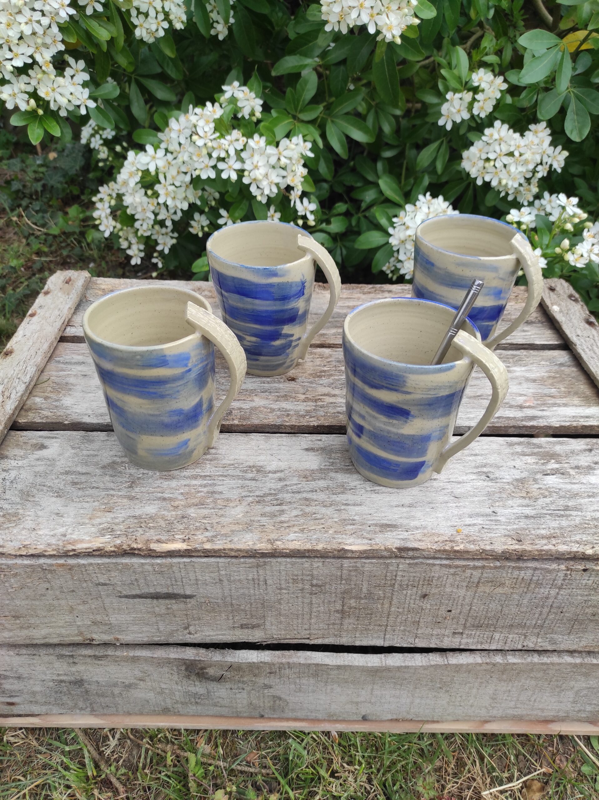 Mugs en grès blanc avec un émail bleu cobalt